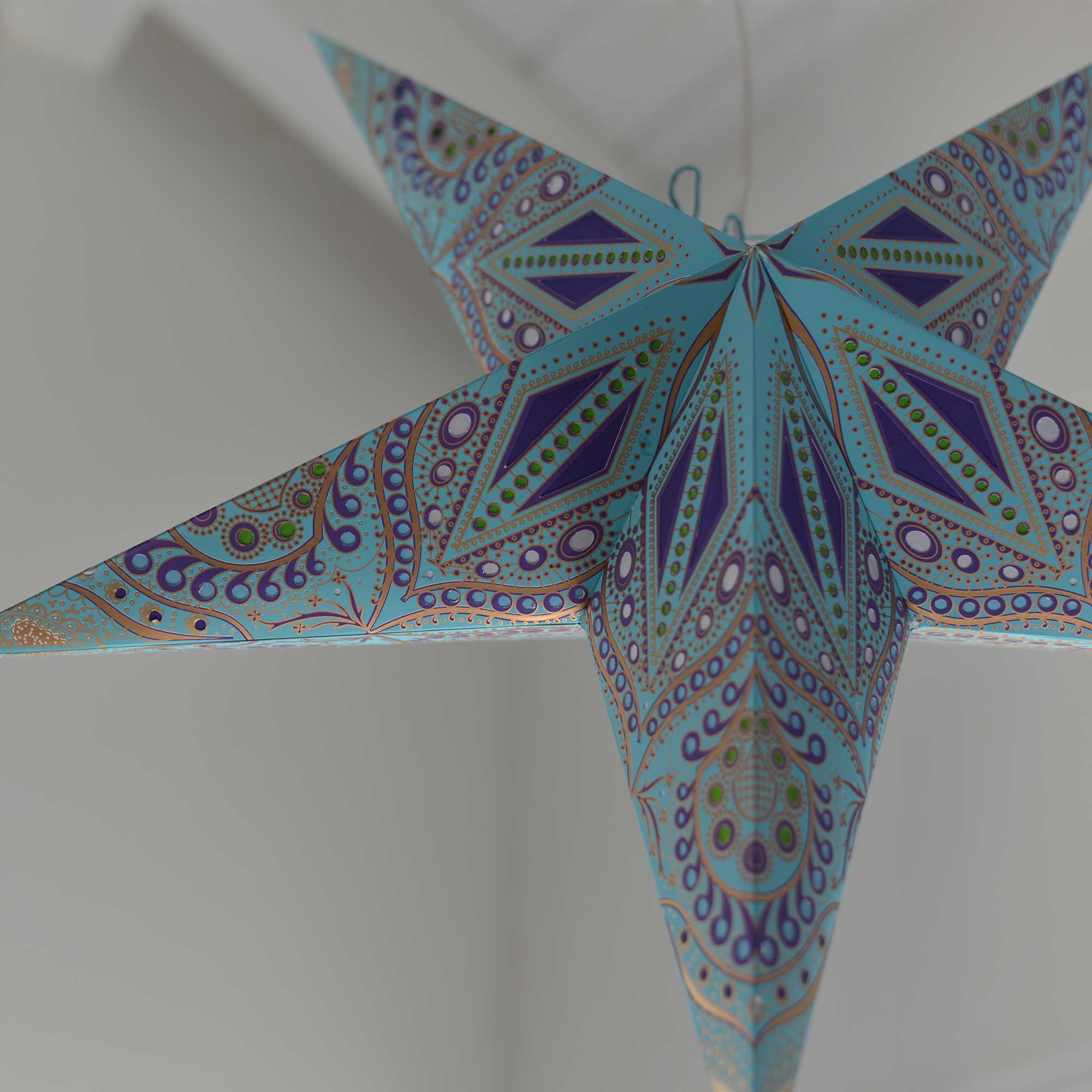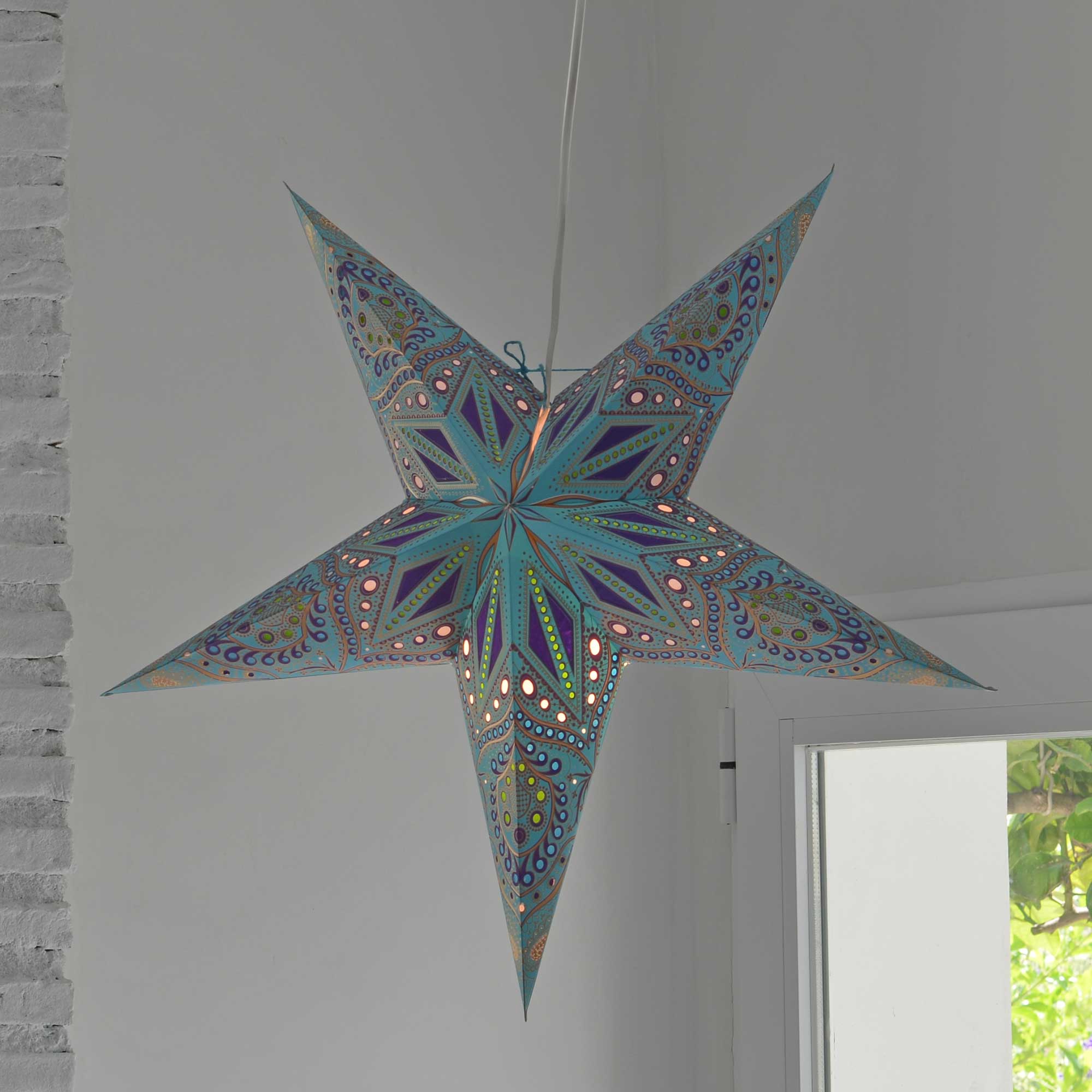 Introducing the Ananda Star Paper Lamp in Blue, featuring stunning gold and green accents. This elegant and unique lamp is the perfect addition to any room, providing a soft and warm glow that adds a touch of sophistication. Handcrafted with care, it is a true work of art that enhances any space.