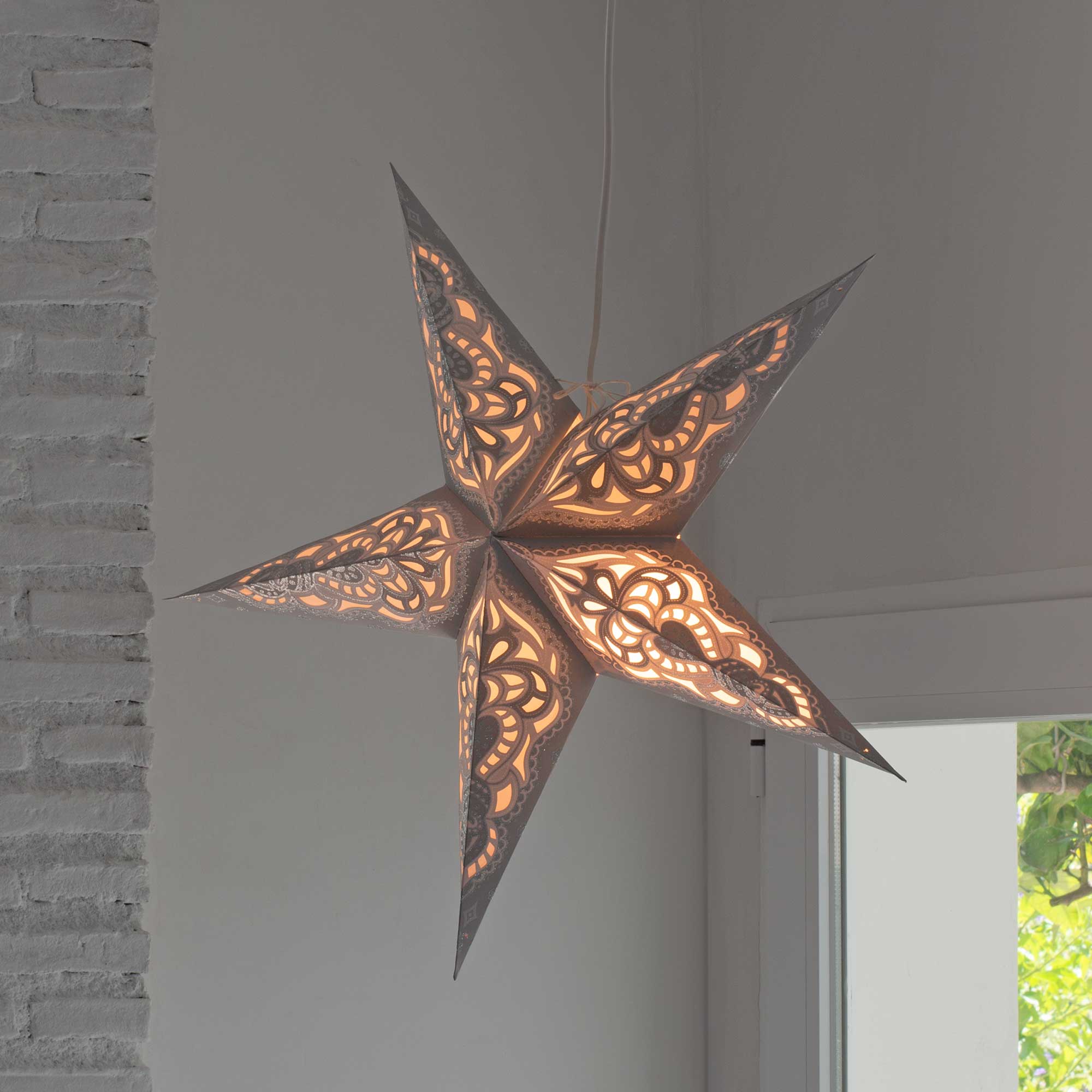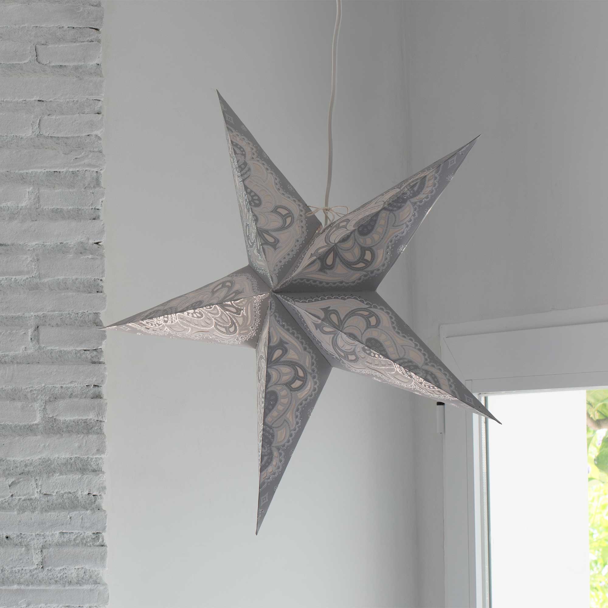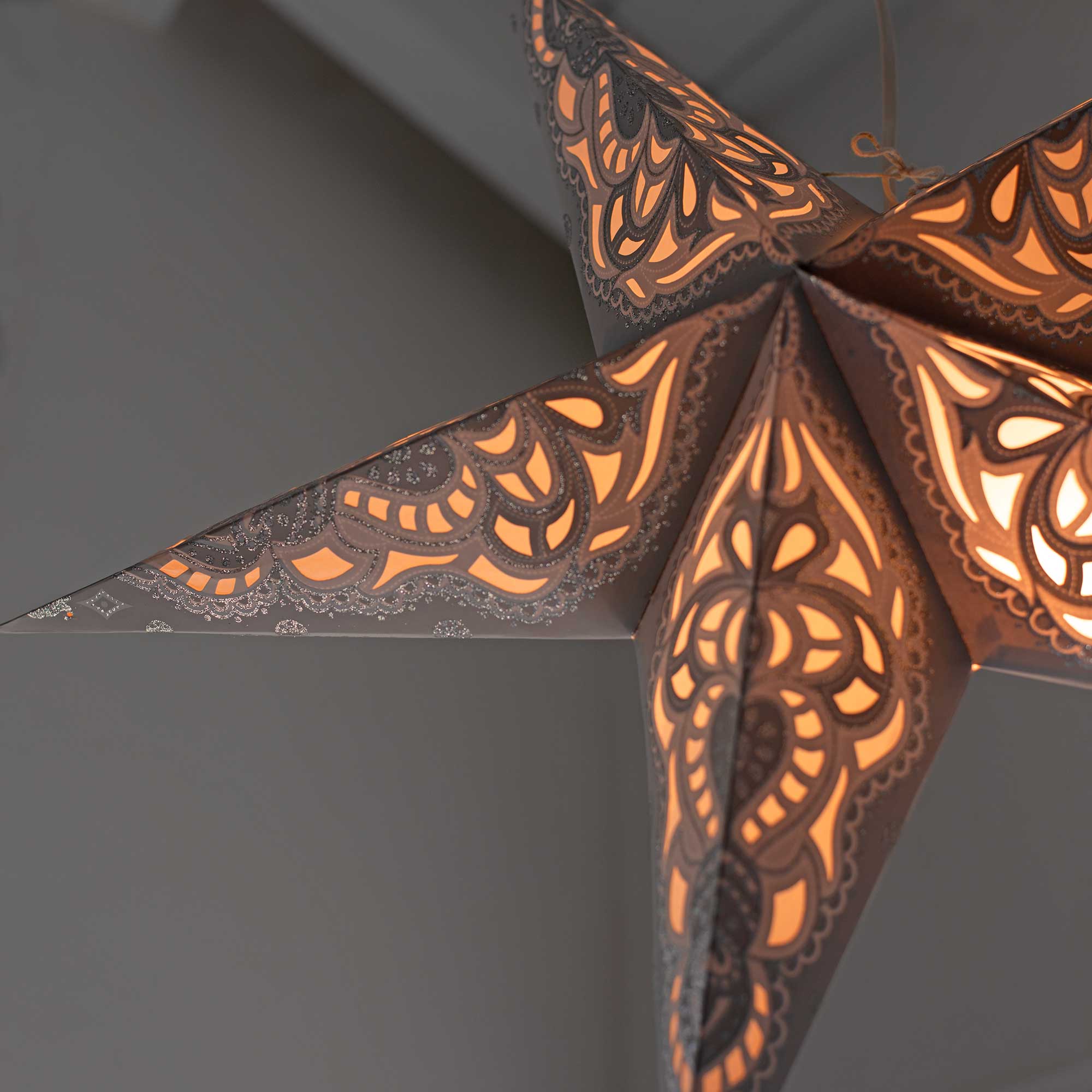 Illuminate your home with the festive charm of our Krishna Star Paper Lamp in White-Grey. The intricate design features ✨silver glitter✨ giving off a cheerful festive vibe. Add a touch of whimsy to your decor and create a warm ambience with this unique paper lamp.