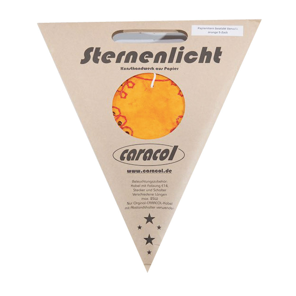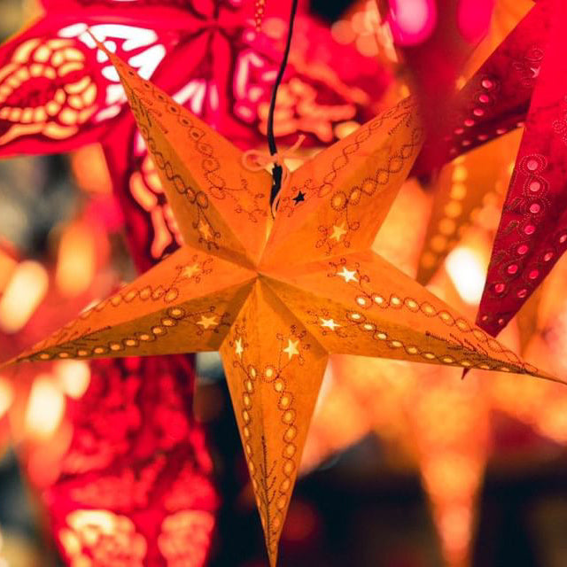 Elevate your holiday decor with our Venezia Star Paper Lamp in Orange. Hand-embroidered paper creates a stunning display, perfect for adorning your window. Our bestselling lamp adds a touch of luxury with its intricate design. The golden embroidery brings a touch of elegance to the hand dyed craft paper. Add colour to your home this season with this exclusive piece.